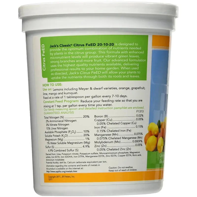 A fertilizer specially formulated for citrus plants. This 20-10-20 fertilizer will give your citrus plants the nutrients they need to grow. This formula will help your plants produce beautiful green leaves and more fruit. Apply as directed. Can be used on lemons, limes, oranges, tangerines, and other citrus plants.